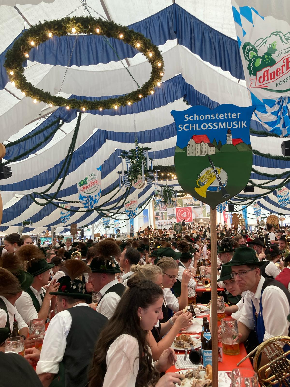 Im Sommer 2024 war die Schonstetter Schlossmusik wieder fleißig auf Festen und Feiern in der Region unterwegs. Begonnen hat alles mit dem Frühlingsfesteinzug in Wasserburg im Mai, gefolgt vom Alpenregionstreffen der Gebirgsschützen in Garmisch (siehe Beitrag unten) und dem Trachtenfest in Pittenhart. Ein Muss im Jahreslauf ist das Bezirksmusikfest, das heuer in Schönau ausgerichtet wurde. Nach festlichem Gottesdienst und Festzug (mit nassem Ende) wurde im Bierzelt noch gemeinsam mit allen anderen Kapellen des MON-Bezirks Inn-Chiemgau der Gemeinschaftschor zelebriert - immer wieder ein Highlight für alle Musikanten, aber auch für die Zuhörer.